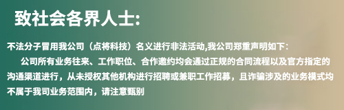 點將(上海)科技股份有限公司近期發(fā)現(xiàn)有不法分子冒用點將科技名義,偽造官方文件、資料、社群、APP等手...
